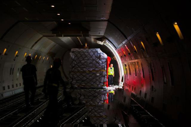 2018年5月18日,無錫機(jī)場工作人員正在對運(yùn)往德國哈恩的貨物進(jìn)行搬運(yùn)。